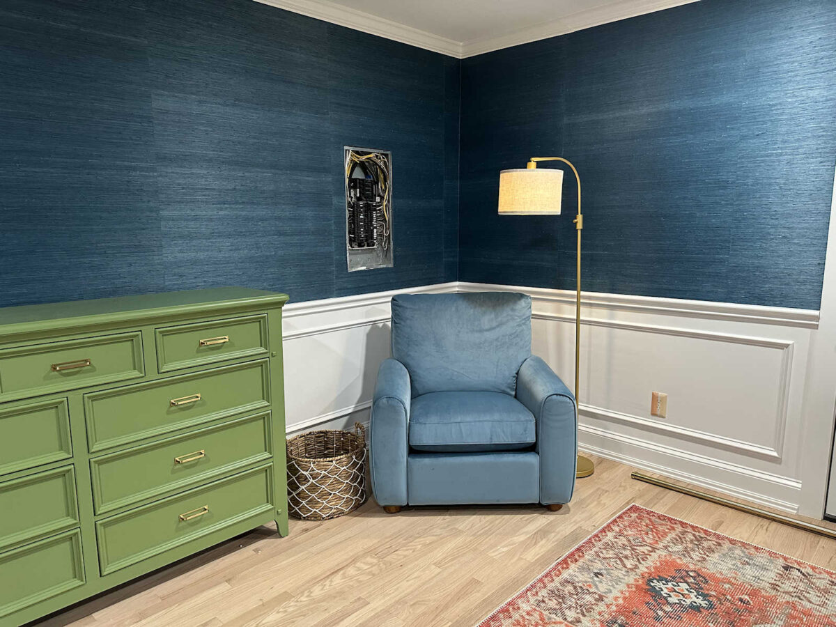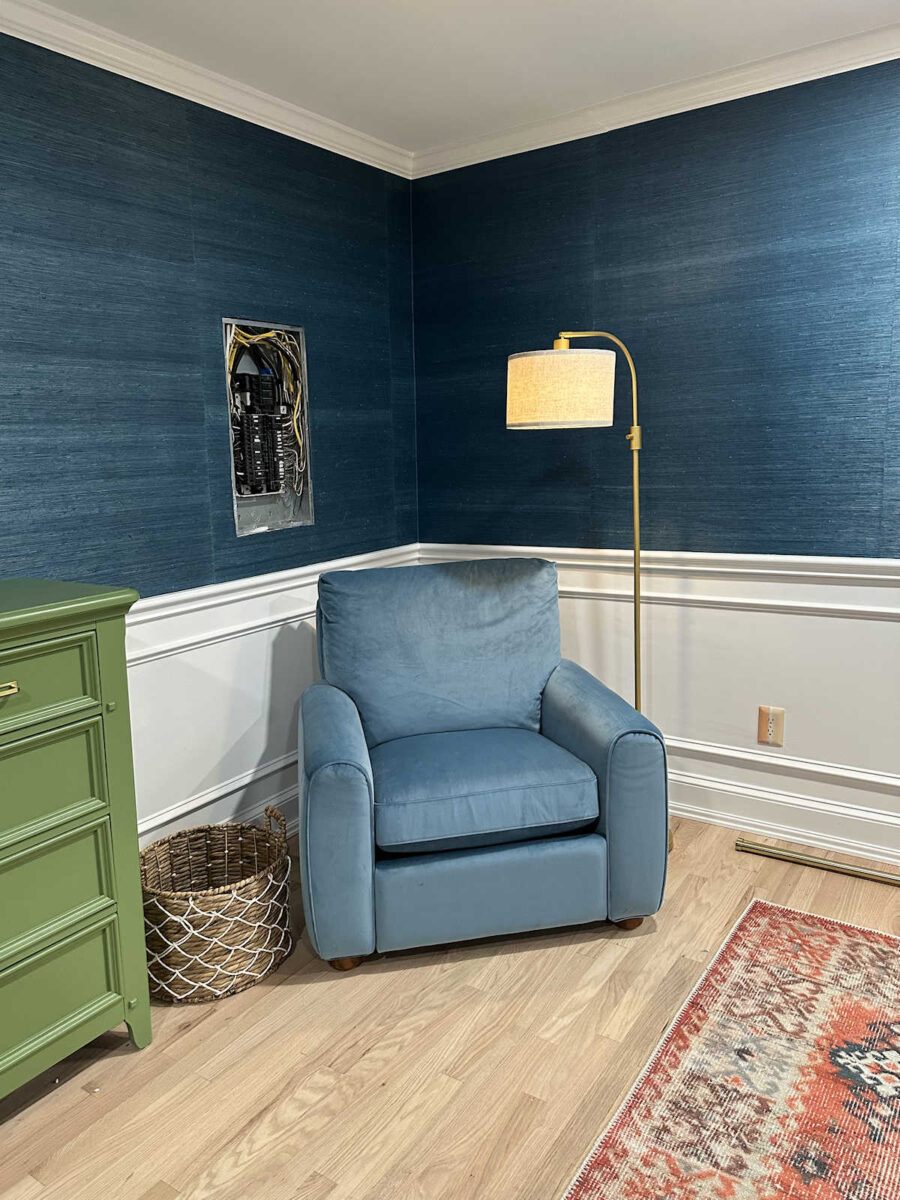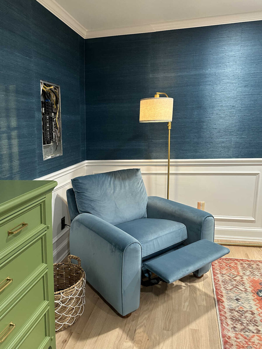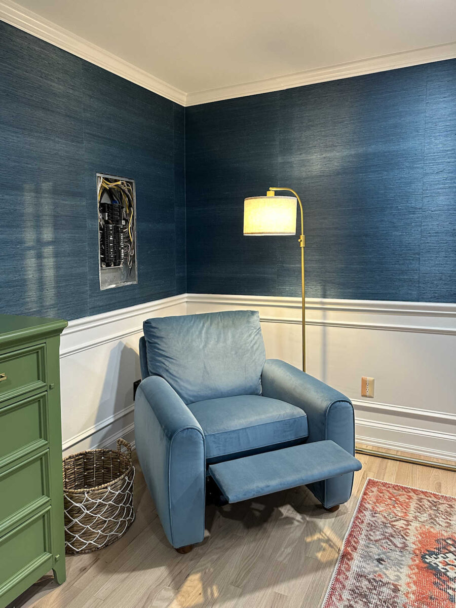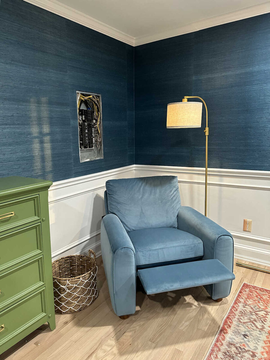 The recliner that I ordered for the bedroom arrived yesterday. It’s about three weeks later than the estimated delivery date, but the wait was totally worth it. I’ve been so nervous about this recliner because I chose the fabric from a pretty small swatch. My main concern was that it was going to be too blue, but it turned out to be perfect. Everything about it is perfect — the size, the color, the comfort.