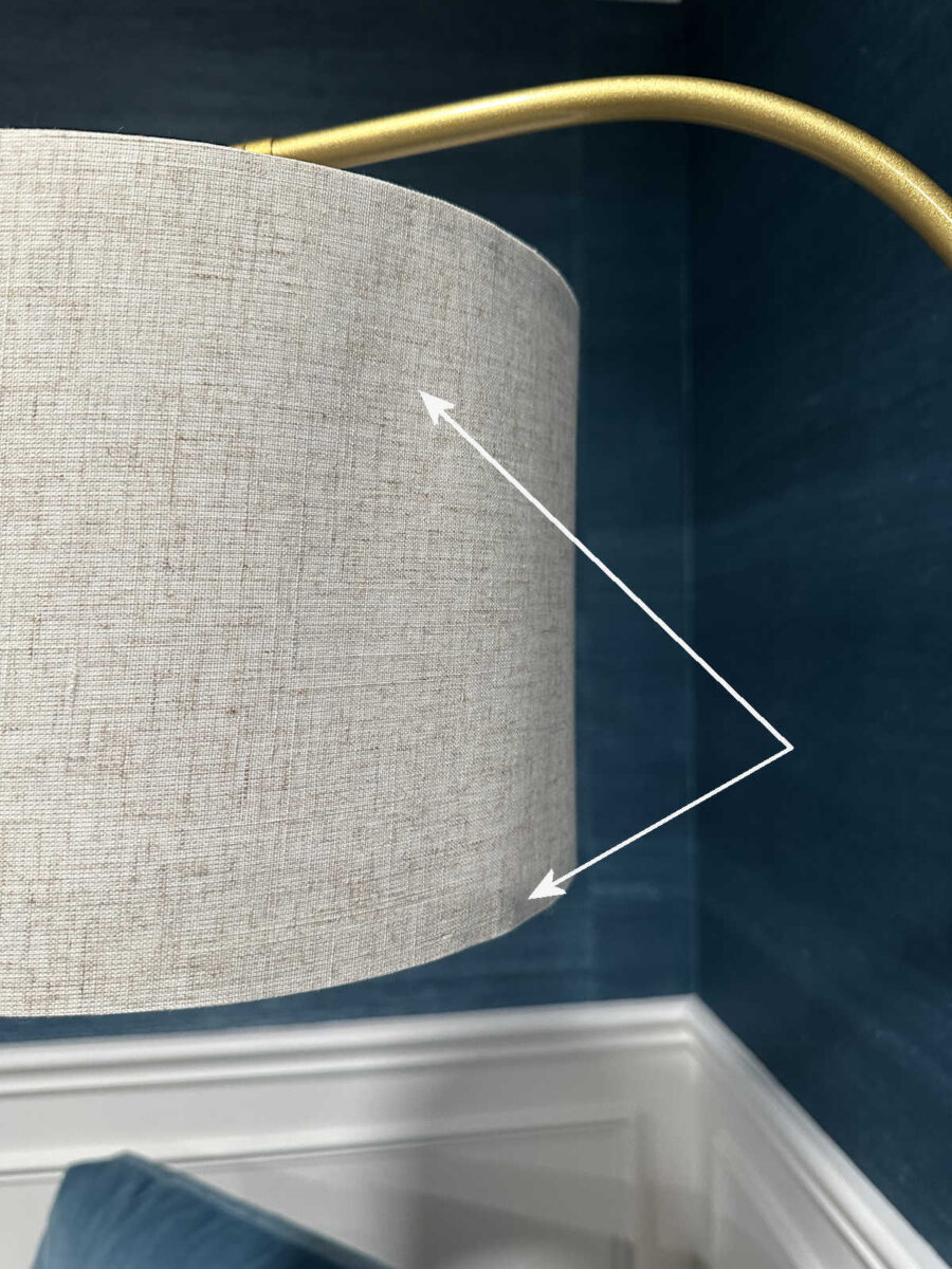 I decided on this one because I liked the arch, the smaller shade, and the color of the shade. I didn’t want a stark white shade. But I wasn’t quite sure what I’d get with a floor lamp that’s under $50. Overall, I’m quite happy with it, but I was a bit taken aback to find that I had to actually put the lamp shade together. I expected to have to assemble the lamp, but I don’t think I’ve ever bought a light that needed assembly on the actual lampshade. It has these clips that clip onto the rings, and while it worked pretty well, you can see these slight puckers on a couple of places around the rings (bottom arrow) and there’s this one place that looks like a dent (top arrow). It’s not actually a dent. It’s just that when the fabric clips into the rings like this, it’s impossible to pull it taut enough to get it perfectly flat.