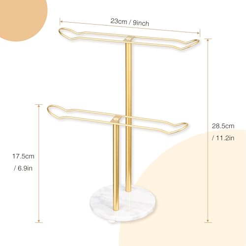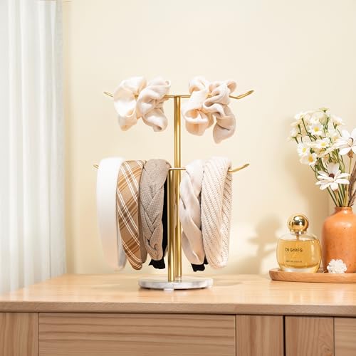 Organize your hair accessories effortlessly with this double-layer headband and scrunchie holder. Designed with a sleek two-tier structure, it provides ample space for headbands, scrunchies, hair ties, and clips, keeping your vanity, bathroom, or dresser neat and tidy. Crafted from a durable metal frame and natural marble base, this stand offers a perfect balance of elegance and stability. Easy to assemble in just one minute, it’s the ideal solution to declutter your space while showcasing your favorite accessories. Upgrade your organization today with this stylish and practical hair accessory stand! Perfect for personal use or as a thoughtful gift for women, teens, and girls.